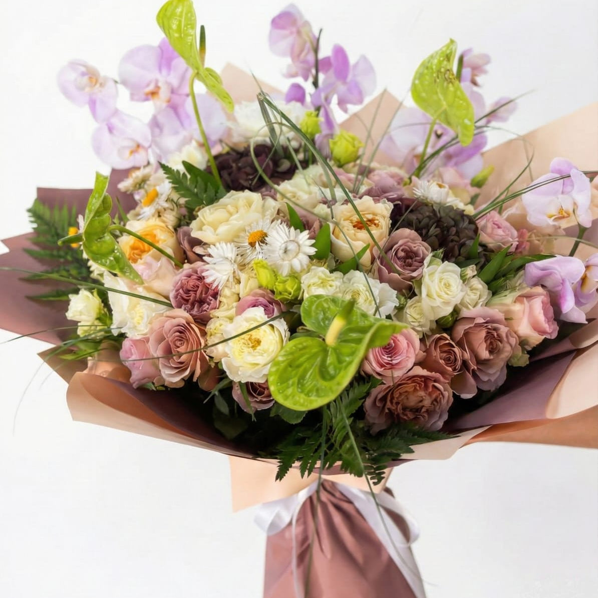A dreamy bouquet that brings the beauty of a lush garden to life. Featuring 5 vibrant anthuriums, 4 graceful orchids, 40 classic roses, 10 delicate spray roses, and 10 romantic English roses—all arranged in soft, muted tones with playful textures. Perfect for the elegant and whimsical soul.