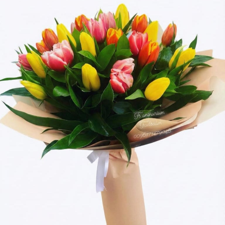 A vibrant bouquet of 25 tulips in a delightful mix of yellow, pink, and orange hues. Wrapped in soft beige paper and accented with lush green foliage, this arrangement brings a fresh, cheerful touch perfect for brightening any occasion or expressing warm wishes.