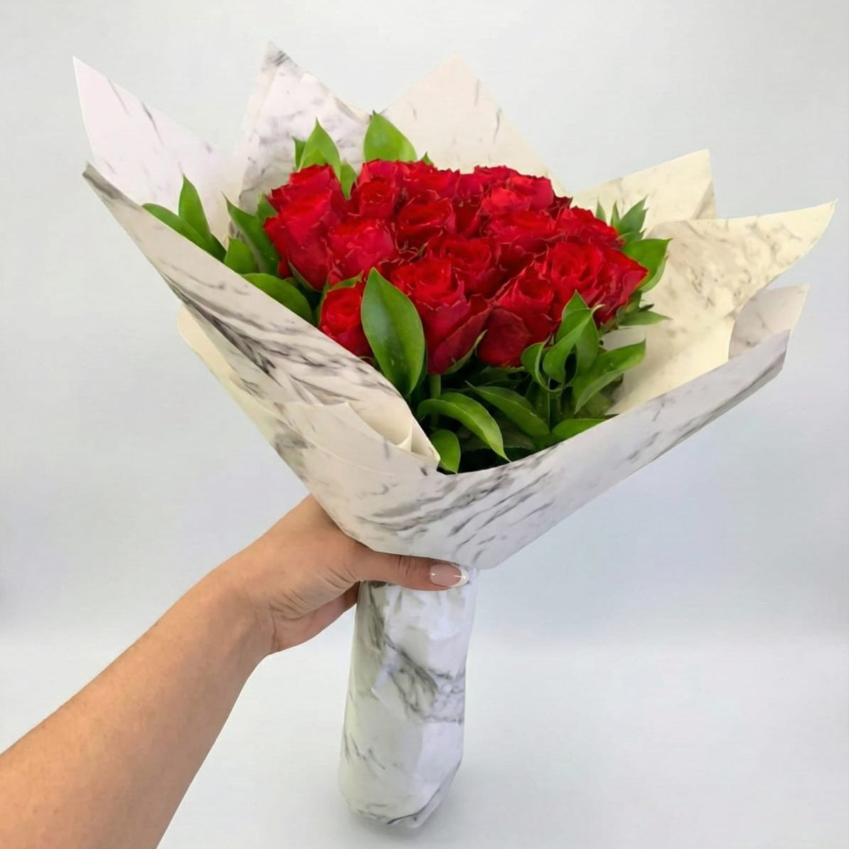 This graceful bouquet showcases 20 beautifully arranged roses paired with fresh green foliage, wrapped in a chic marble-patterned paper. A perfect gesture to convey admiration and heartfelt emotions for any special moment.